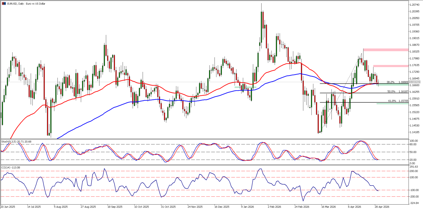 سلك زوج اليورو مقابل الدولار الأمريكي مسار صاعد ثابت منذ مارس 2026، ومن ثم بدأ موجة تراجعات تصحيحية بعد تسجيله مستوى 1.1850. لكنه قد يشهد توقف مع اختباره لمنطقة دعم قد تكون حاسمة.