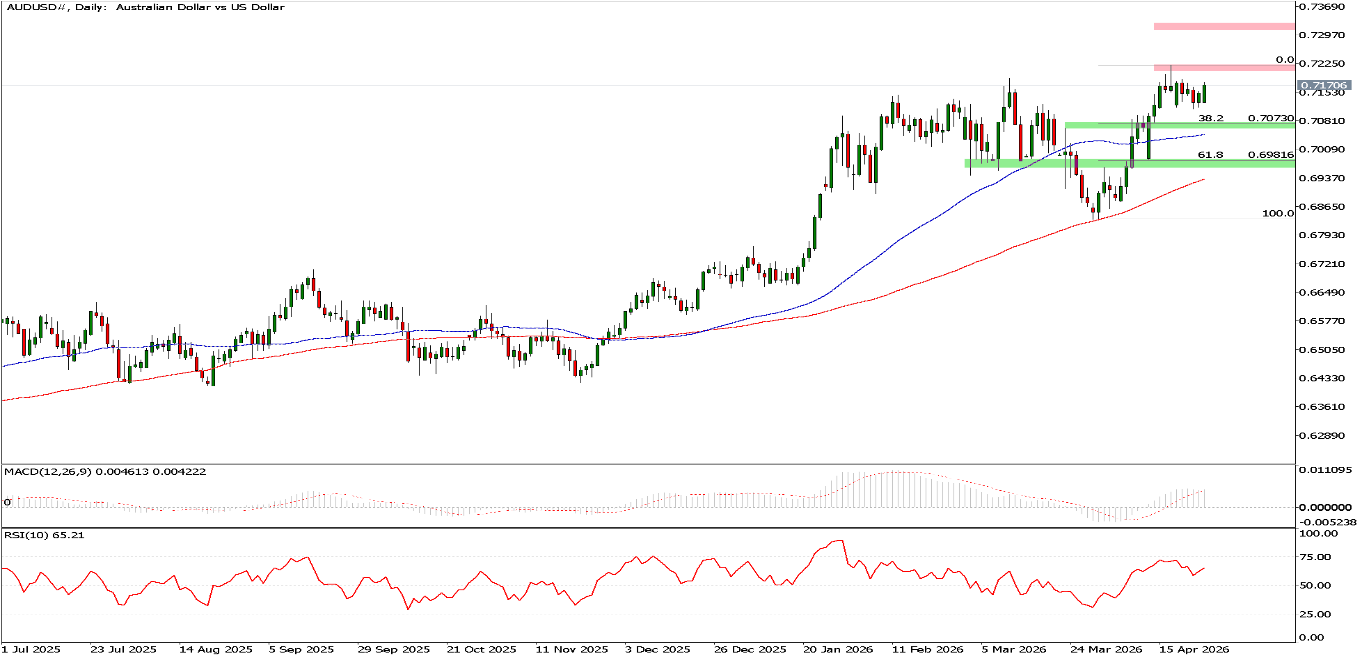 تراجع الدولار الأسترالي أمام نظيره الأمريكي بعض الشيء في الجلسات الأخيرة الماضية، بعد موجة صعود قوية دفعته لأعلى مستوياته في حوالي أربع أعوام. وقد بدأ الزوج يفقد بعضًا من زخمه الصعودي بظل جو من الحذر يغمر الأسواق وسط الغموض الذي يلف تطورات الحرب الأمريكية–الإيرانية وعدم وضوح مسارها في المدى القريب.